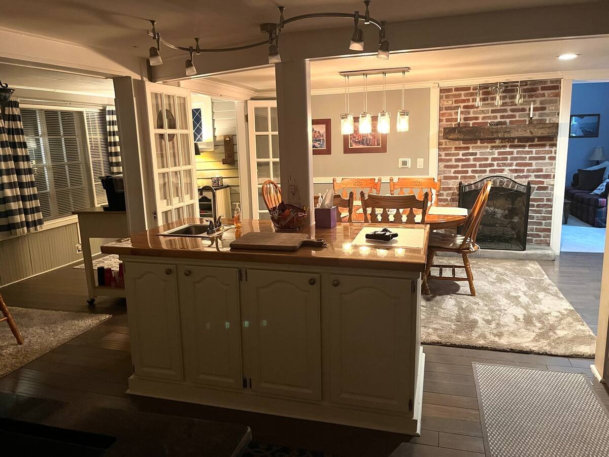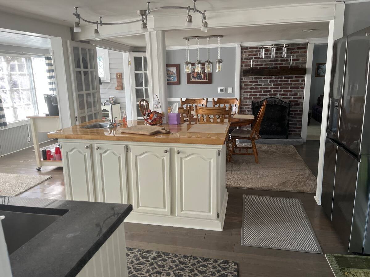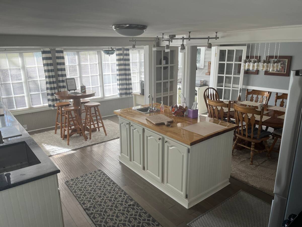 Our kitchen with windows across the back, gas stove, large fridge and plenty of prep space. We grill a lot, grill outside of kitchen and bbq down by the firepit.