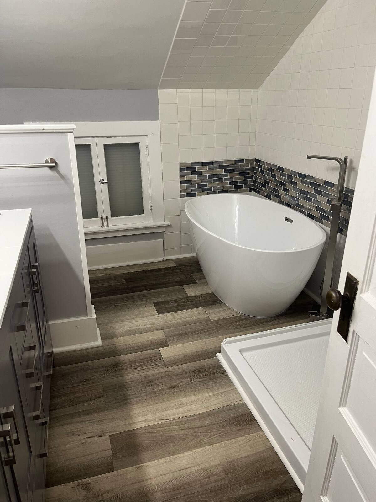 Upstairs bathroom, double sink, shower and freestanding tub.